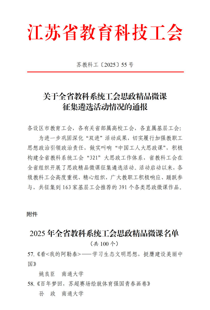 近日,江苏省教育科技工会发布2025年全省教科系统工会思政精品微课征集遴选活动结果通报,共100件政治方向正确、内容科学严谨、形式创新多样的思政精品微课入选。我校生命科学学院姚良臣、药学院孙政的两件作品成功入选。
