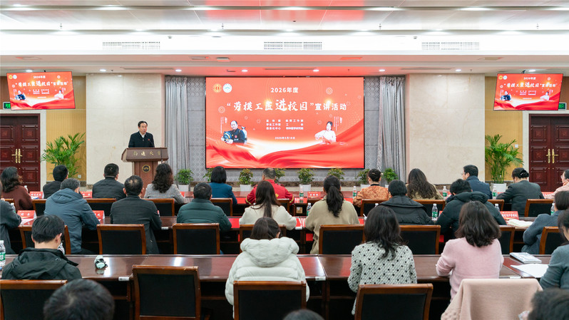 为深入学习贯彻习近平总书记在庆祝中华全国总工会成立100周年暨全国劳动模范和先进工作者表彰大会上的重要讲话精神,3月18日下午,我校2026年度“劳模工匠进校园”宣讲活动隆重举行。活动采用线上线下相结合的方式,主会场设在啬园校区图书馆508会议室,各二级单位和“一站式”学生社区共设44个分会场,全校共1500余名师生参与。校党委常委、副校长吉明明致辞并为两位劳模工匠颁发“南通大学思想政治理论课兼职导师”聘书。学校各党政职能部门相关代表出席活动。